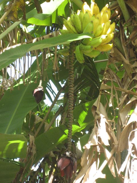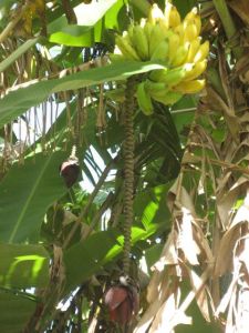 I’ve been eyeing the rack for a week now. I pass the banana tree daily and see the yellow hands slowly being picked away by the birds. The fruit is ripe and ready but I’m wondering how I’m going to get it. In my seven years living on this island, I have cut down many banana trees. It takes some muscle but not a lot of brawn. Harvesting bananas entails cutting down the whole tree, slicing into its soft, sinewy stalk, which is thick, watery and heavy. After the banana rack is taken from the tree, the trunk is chopped into small pieces fertilizing the soil for the new tree that will grow from the stump of the old.