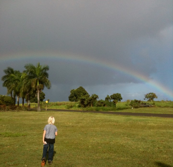 A rainbow arches and Jeb walks through the gateway.  We’re chewing gum and he’s trying to learn the art of making a bubble.  He wants constant demonstrations and can’t help but cheat and use his fingers.