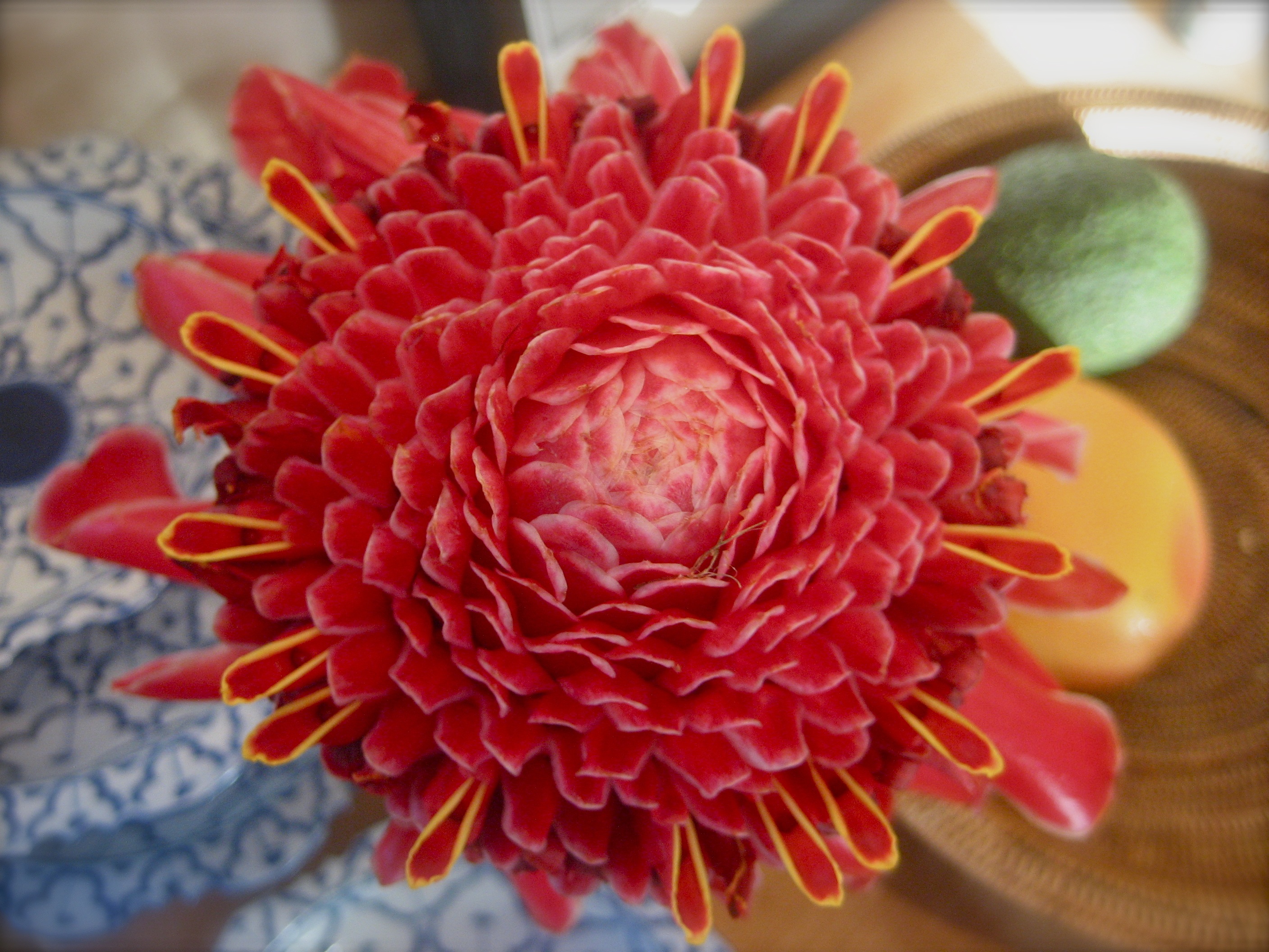 On the way back home he gets ahead of me. It’s ok now, these days, for him to be a bit on his own. He beats me to the house. I arrive at the front door as he opens it from inside, a red ginger flower outstretched in his hand. It’s the third flower he’s picked for me today. I put it in an old glass honey jar.
