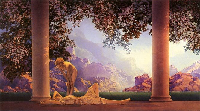 This morning I wake early enough to watch the day come on. Reminded of a Maxfield Parrish painting – the modern, tropical-version-style, complete with telephone lines.