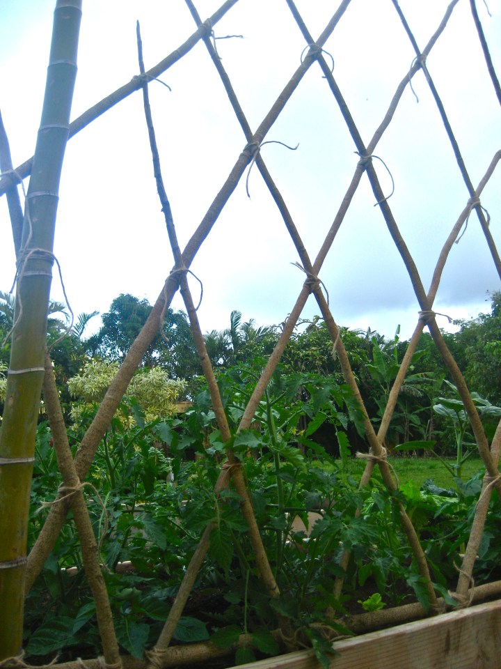Always using what we have, the Bohemian takes the trimmings from the panax hedge and crafts a trellis for the garden tomatoes.