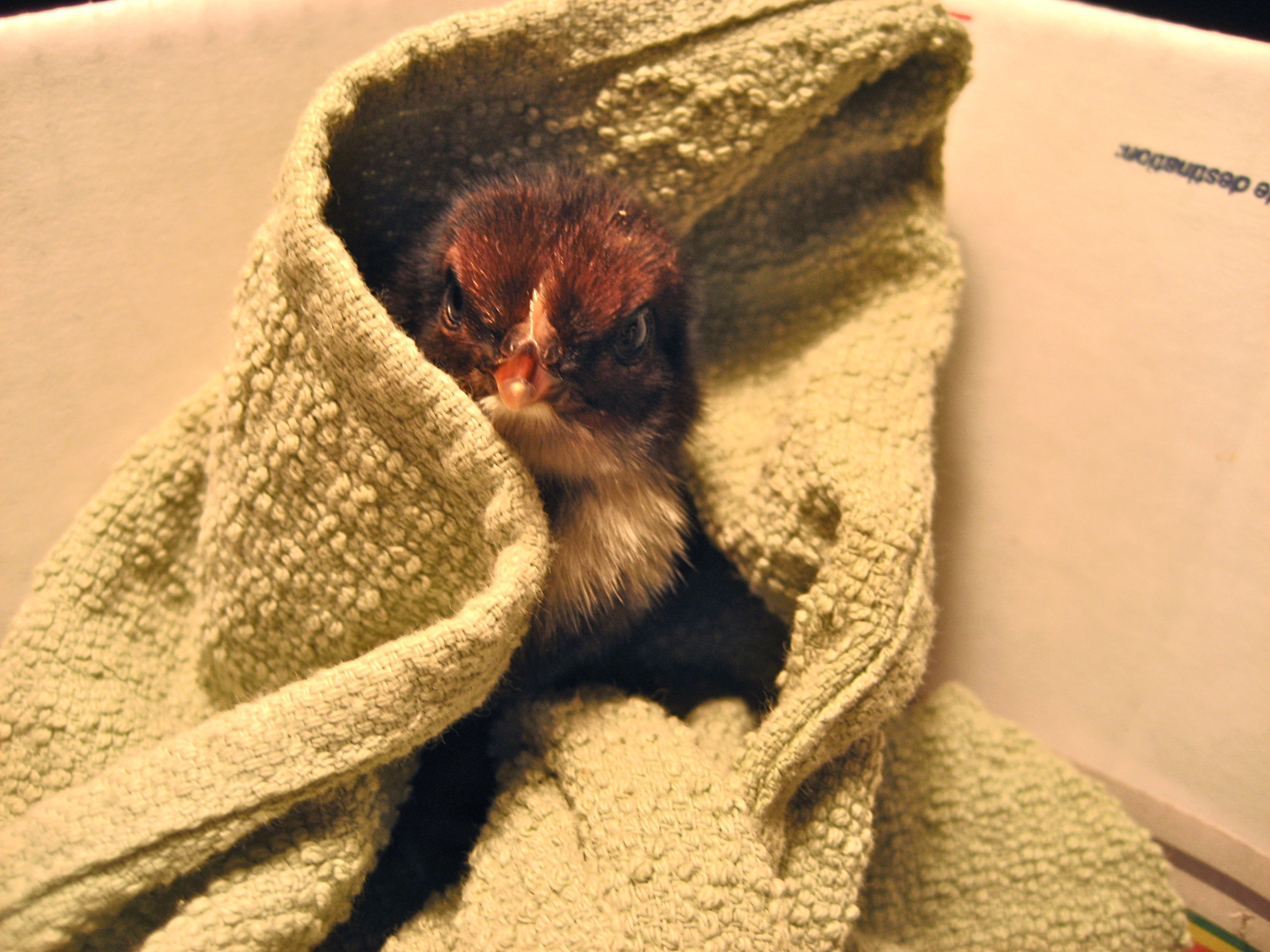So make fun of us if you will. I’m laughing at myself. When at 3:37am this morning, our little friend is chirping the “I’m cold!” call. The one that repeats in a monotone, much like a mini-car alarm. He has the heating lamp and towels in his little cardboard box, but sometimes in the early morning chill it’s not enough. Besides, he’s a flock-by-nature kind of animal and sometimes wants a little company.