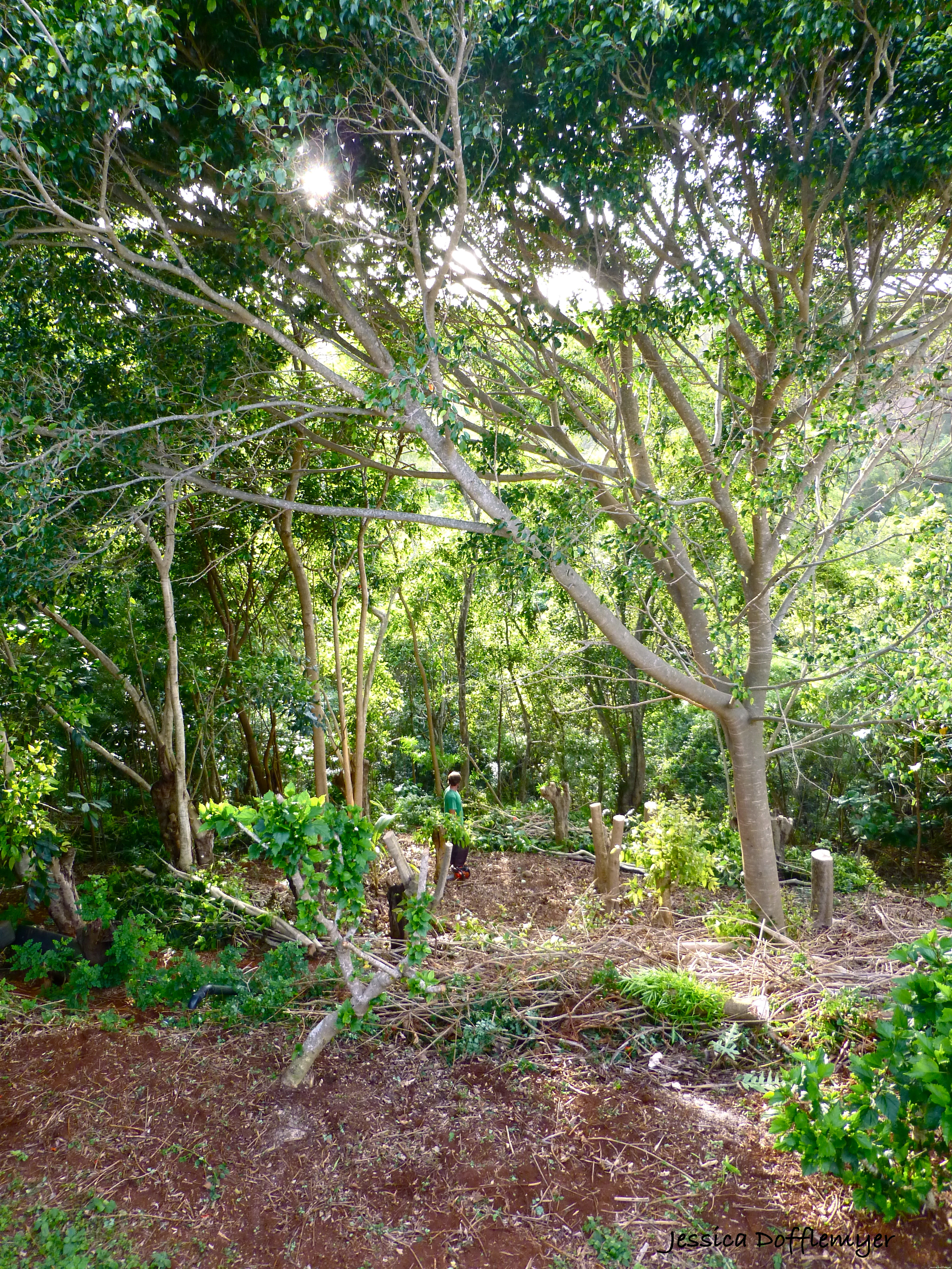 The Bohemian continues to amaze me with his determination, as he opens up space on our back hillside. He takes out scattered invasive trees, making room for two large Banyans to stretch their limbs. Nothing will go to waste.