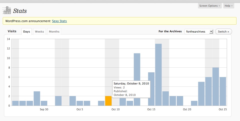 Ultimately, it’s not about the site statistics. I actually started For the Archives afraid anyone would see it at all. But as this project has evolved, I have found the power of the writing and a desire to touch a common space of humanness with whoever reads the words (single, double, triple digits, no matter).