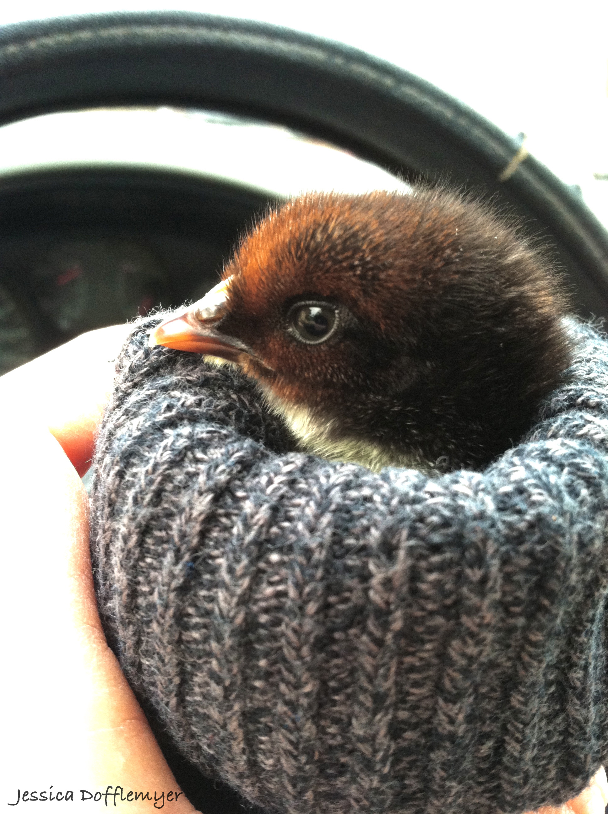 Right now I do see a pretty cute little chick-a-dee. And I see myself, right there, at his service. I’m laughing in all the ridiculousness. Wondering how in the world it came to be that I am driving down the road with a chicken in a sock.