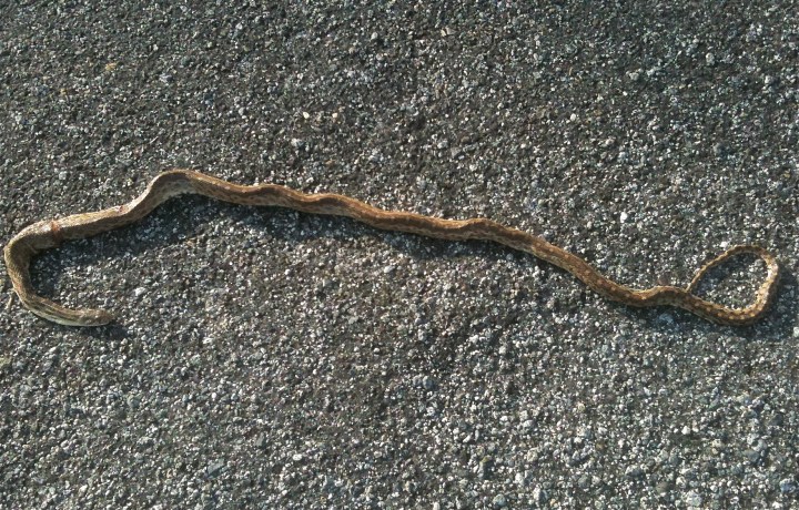Here we see the long shape of a gopher snake, clearly deceased, with the story of its demise marked along its back. Jeb’s first sighting of a snake in real life, this close.