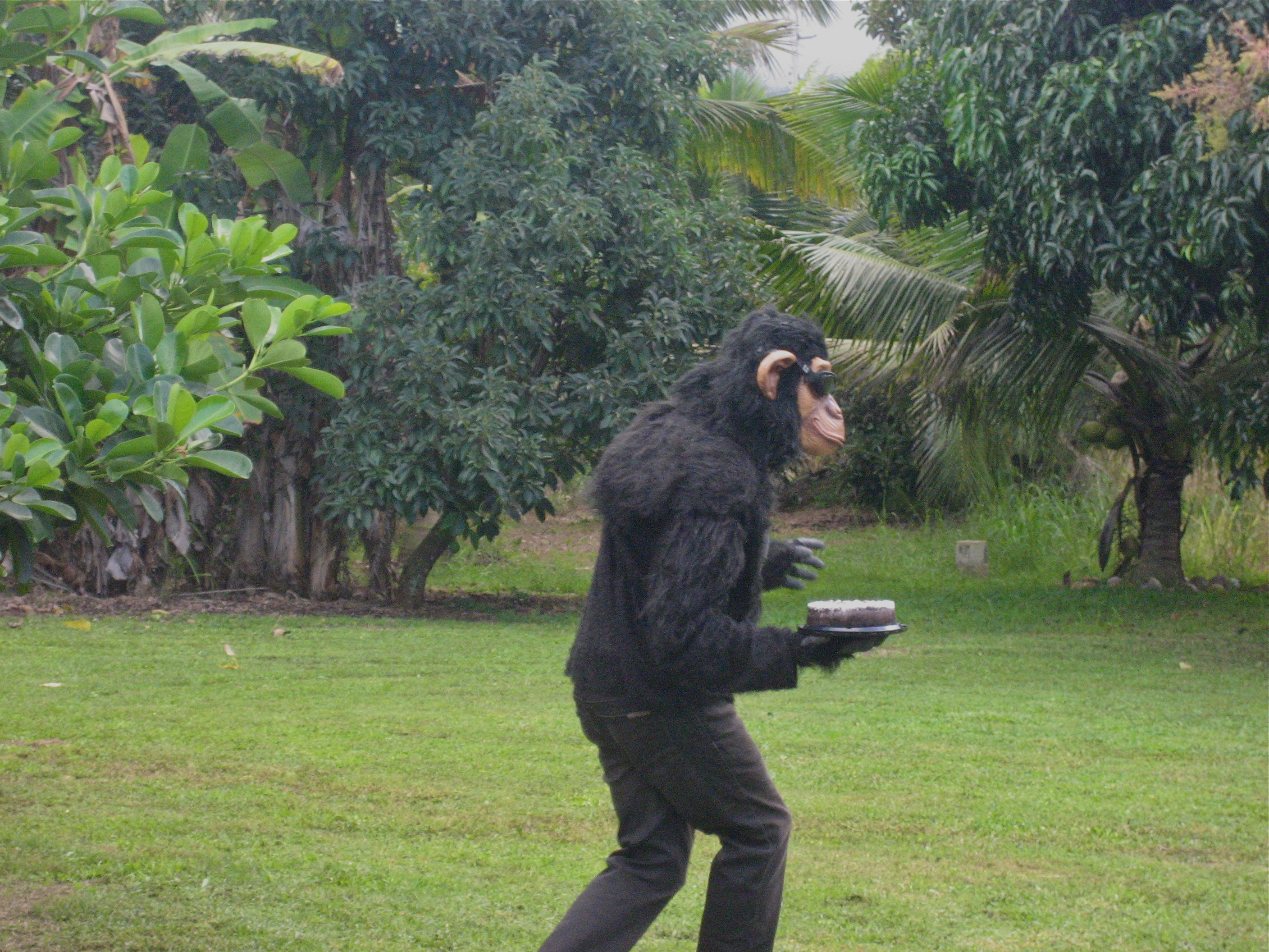 In the two hours, pre-party, the man had juiced 40 starfruit, cleared dead coconut fronds from the yard, taken down cobwebs on the lanai and cleaned the barbecue grill. Just when I thought he couldn’t do much more, he suggests the gorilla suit.